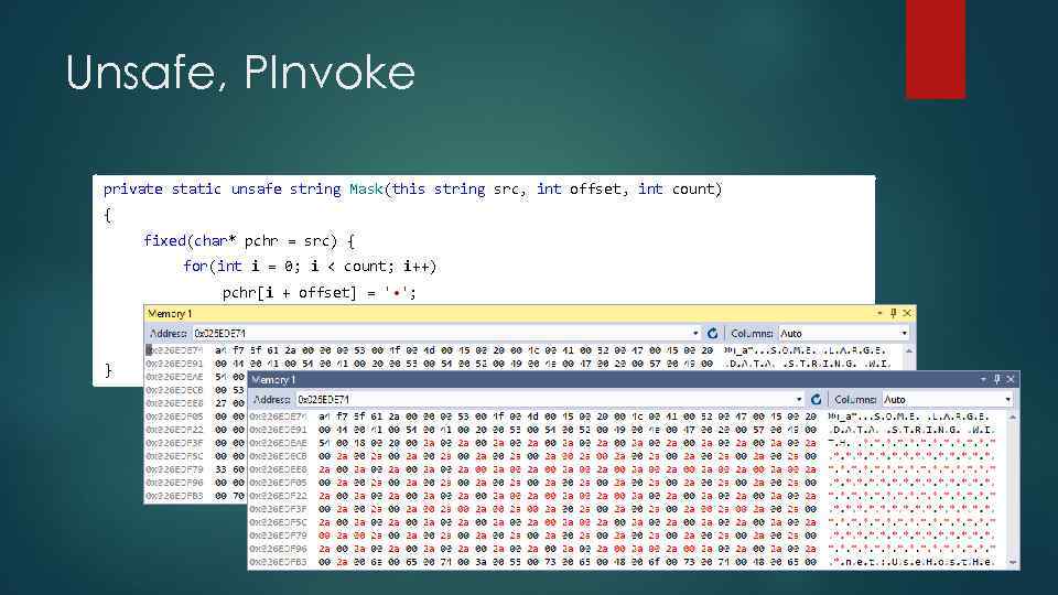 Unsafe, PInvoke private static unsafe string Mask(this string src, int offset, int count) { fixed(char* pchr = src) { for(int i = 0; i < count; i++) pchr[i + offset] = ' • '; } return src; }