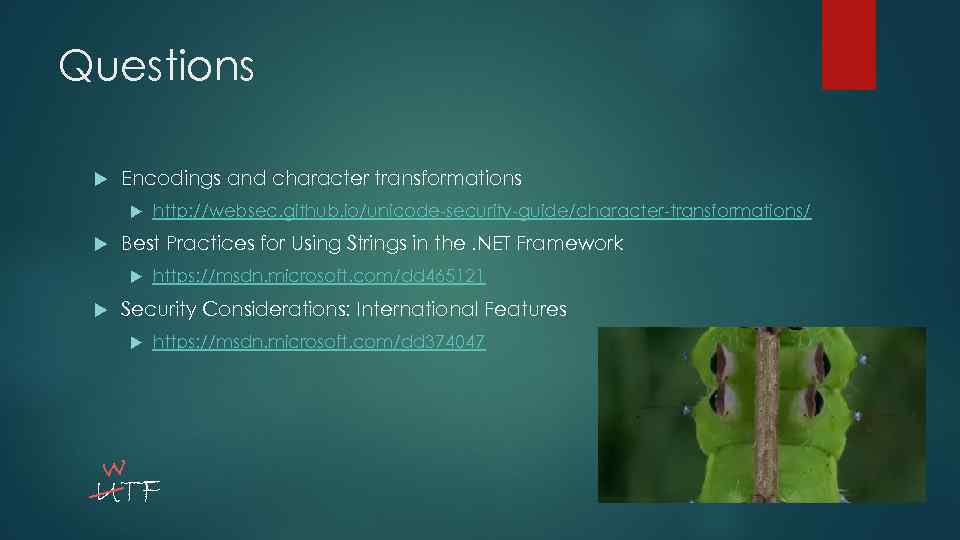 Questions Encodings and character transformations Best Practices for Using Strings in the. NET Framework http: //websec. github. io/unicode-security-guide/character-transformations/ https: //msdn. microsoft. com/dd 465121 Security Considerations: International Features W https: //msdn. microsoft. com/dd 374047 UTF