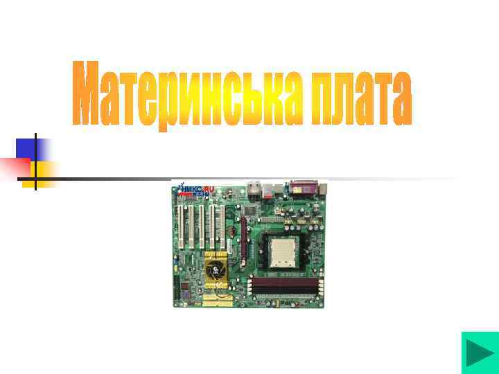 Зміст 1. 2. 3. 4. 5. 6. Поняття материнської плати Призначення материнської плати Класифікація материнських плат по форм-фактору Головні складові материнської плати: 1. Chip-set 2. Мікропроцесор 3. Шина 4. Типи шин 5. Роз’єми Стандарт PCI Виробники материнських плат