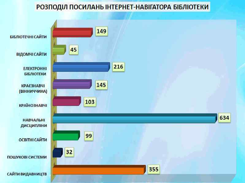 ЕЛЕКТРОННІ РЕСУРСИ БІБЛІОТЕКИ: ЕЛЕКТРОННИЙ КАТАЛОГ: понад 200 тис. БЗ, майже 70 ГБ ІНСТРУКТИВНІ ТА НАВЧАЛЬНОМЕТОДИЧНІ МОДУЛІ: ІНТЕРНЕТРЕСУРСИ: понад 700 МБ ТЕМАТИЧНІ ТЕКИ ТА ДОБІРКИ: 9 ГБ 10 БД ДОСТУПНИХ КОРИСТУВАЧЕВІ, 7 СЛУЖБОВИХ БАЗ ДАНИХ МЕДІАТЕКА ОСНОВИ ІНФОРМАЦІЙНОЇ КУЛЬТУРИ КОРИСТУВАЧА. МЕТОДИКА ПОШУКУ В БД ЕК. МЕТОДИКА СТВОРЕННЯ ПРЕЗЕНТАЦІЙ WEB-САЙТ, БЛОГ, ГОСТЬОВА КНИГА, ІНСТИТУЦІЙНИЙ РЕПОЗИТАРІЙ ІНТЕРНЕТ-КАТАЛОГ “ВІННИЧЧИНА В ІНТЕРНЕТІ”, “ПОДІЛЬСЬКІ ПЕРСОНАЛІЇ”, ФОТОАРХІВ ТА ПОРТРЕТНА ГАЛЕРЕЯ АРХІВ ВИКОНАНИХ ЗАПИТІВ, КОЛЕКЦІЯ ЗОБРАЖЕНЬ ТА ПРЕЗЕНТАЦІЙ