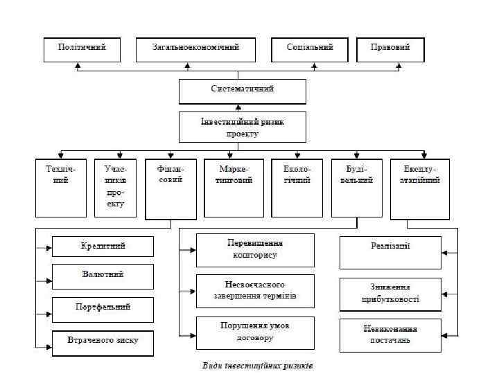 КЛАСИФІКАЦІЯ ІНВЕСТИЦІЙНИХ РИЗИКІВ Відповідно до сфери прояву економічні ризики політичні ризики соціальні ризики екологічні ризики інші види ризиків (рекет, крадіжки майна, брехню з боку інвестиційних чи господарських партнерів тощо) Відповідно до форми інвестування ризики реального інвестування ризики фінансового інвестування Відповідно до джерел виникнення систематичні (ринкові) ризики несистематичні (специфічні) ризики.