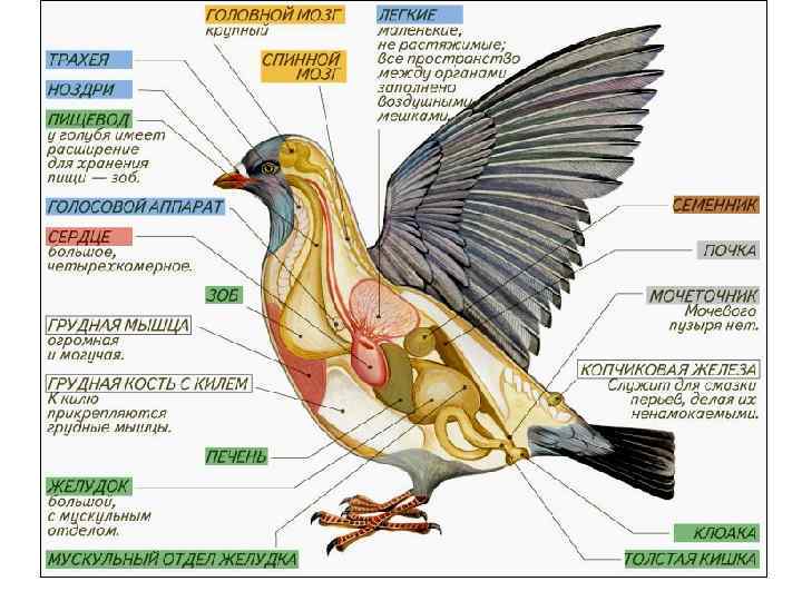 Строение и жизнедеятельность У голубя имеется зоб, в котором не только происходит набухание зерен, но в период выкармливания птенцов образуется «птичье молоко» — белая питательная творожистая масса для выкармливания птенцов. Из зоба набухшие зерна по пищеводу отправляются в желудок, в его первый, железистый отдел, где на пищу воздействуют ферменты. В мускульном отделе происходит перетирание пищи с помощью роговых стенок желудка. Кроме того, зерноядные птицы заглатывают камешки, которые помогают перетиранию пищи. Из желудка пищевая масса поступает в двенадцатиперстную кишку, где на нее воздействуют ферменты поджелудочной железы и желчь печени.