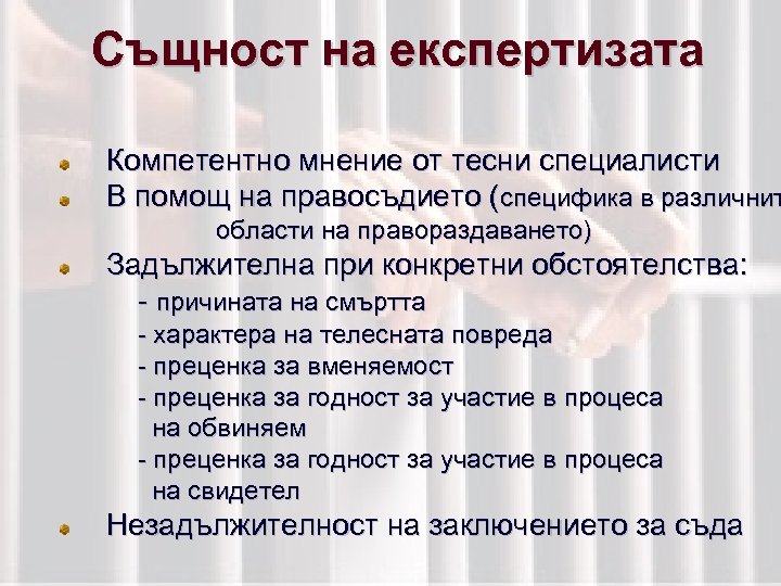 Същност на експертизата Компетентно мнение от тесни специалисти В помощ на правосъдието (специфика в различнит области на правораздаването) Задължителна при конкретни обстоятелства: - причината на смъртта - характера на телесната повреда - преценка за вменяемост - преценка за годност за участие в процеса на обвиняем - преценка за годност за участие в процеса на свидетел Незадължителност на заключението за съда