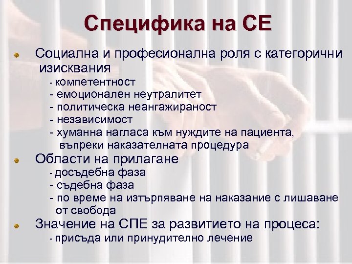 Специфика на СЕ Социална и професионална роля с категорични изисквания - компетентност - емоционален неутралитет - политическа неангажираност - независимост - хуманна нагласа към нуждите на пациента, въпреки наказателната процедура Области на прилагане - досъдебна фаза - по време на изтърпяване на наказание с лишаване от свобода Значение на СПЕ за развитието на процеса: - присъда или принудително лечение