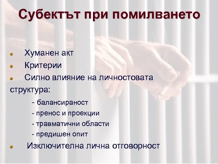 Субектът при помилването Хуманен акт Критерии Силно влияние на личностовата структура: - балансираност - пренос и проекции - травматични области - предишен опит Изключителна лична отговорност