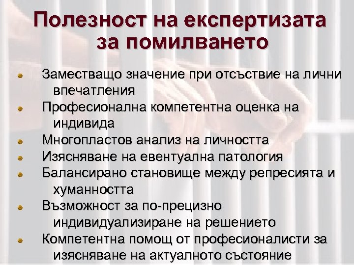 Полезност на експертизата за помилването Заместващо значение при отсъствие на лични впечатления Професионална компетентна оценка на индивида Многопластов анализ на личността Изясняване на евентуална патология Балансирано становище между репресията и хуманността Възможност за по-прецизно индивидуализиране на решението Компетентна помощ от професионалисти за изясняване на актуалното състояние