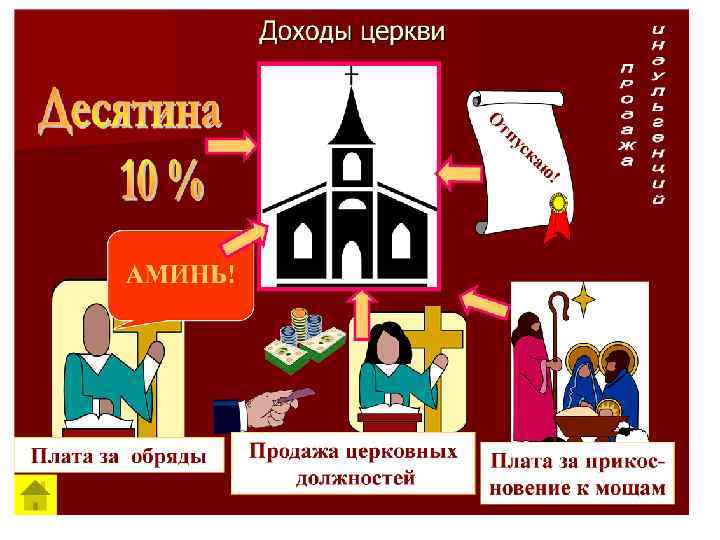 Богатство церкви. Церковь была круп нейшим землевладельцем и обладала ог ромными богатствами. Ей принадлежало около трети возделанных земель в Европе. Епископы и монастыри имели сотни, а по рой и тысячи зависимых крестьян. Со всего населения Западной Европы цер ковь взимала десятину — особый налог на содержание духовенства и храмов. Верую щие платили священникам также за венча ние и другие церковные обряды. Многие за вещали и дарили церкви землю, деньги и другое имущество — на помин или спасе ние души. Кроме этого за проведение каждого обряда, будь то венчание или крещение ребенка, нужно было церкви заплатить определенную сумму денег. Позже появились грамо ты, которые назывались индульген ции. Их продавали за деньги от имени папы римского. Торговля индульгенциями прино сила папам огромные доходы и вызывала негодование истинно верующих граждан.