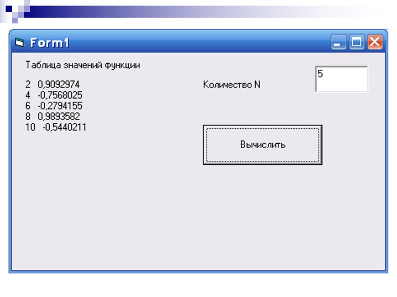 Пример 4 Вычислить таблицу значений функции для аргумента х, изменяющегося от xn до xk с шагом dx. Пример 4 Вычислить таблицу значений функции для аргумента х, изменяющегося от xn до xk с шагом dx.
