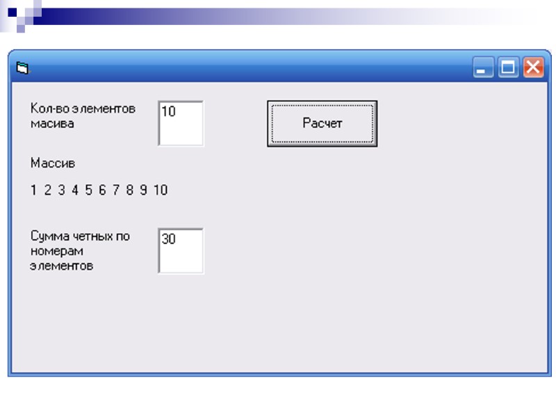 Для одномерного массива, состоящего из N элементов, вычислить сумму четных по номерам элементов Пример 6