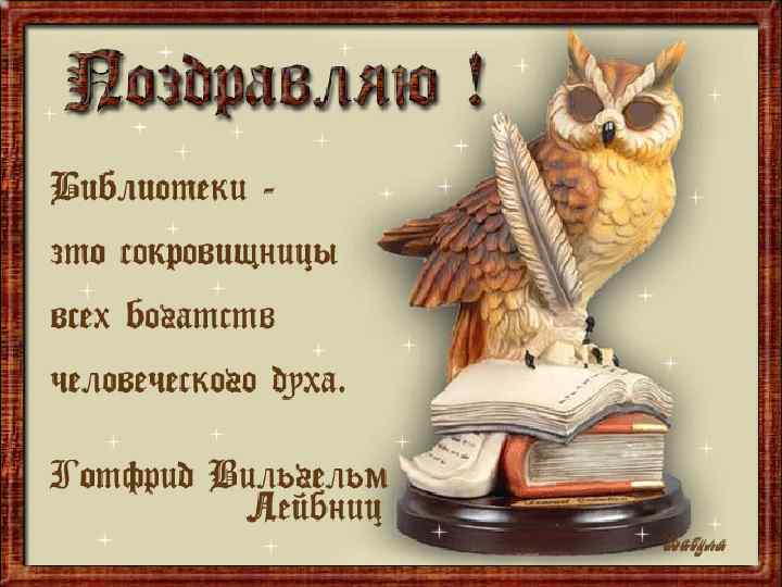 Писатели о библиотечном труде О БИБЛИОТЕКЕ О БИБЛИОТЕК личайшее сокровище — хорошая блиотека. (В. Г. Белинский) Друзья мои, хочу я вам сказать: Хоть мы живём в эпоху атомног Ни зал компьютеров, ни выход Не смогут заменить общенье с ч Недаром говорят, кто в этом зн Коль одолела хворь телесная, б А если вдруг душа болит, Спеши, мой друг, в библиотеку! (Н. Мирошниченко) га – это волшебница. Книга преобразила мир. память человеческого рода, она рупор веческой мысли. Мир без книги – мир рей» . Морозов) отека — это открытый стол идей, за й приглашен каждый, за которым й найдет ту пищу, которую ищет; это — ый магазейн, куда они положили свои и открытия, а другие берут их в рост. рцен) Библиотекарь - первый вестник знания. (Н. Рерих) Быть библиотекарем значит то же, ч велосипеде: если вы перестаете наж педали и двигаться вперед, вы падае