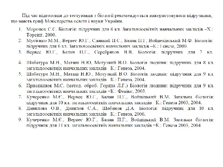 Програма зовнішнього незалежного оцінювання з біології 2012 Програму зовнішнього незалежного оцінювання з біології 2012 розроблено на основі чинних програм для загальноосвітніх навчальних закладів: Біологія, 7 -11 класи (К. : Перун, 2005) та Біологія, 10 -11 класи (Тернопіль, Мандрівець, 2011). • Завданнями зовнішнього незалежного оцінювання з біології є: • перевірити відповідність знань та умінь учнів програмним вимогам; • виявити рівень навчальних досягнень учнів; • оцінити ступінь підготовленості випускників загальноосвітніх навчальних закладів до подальшого навчання у вищих навчальних закладах