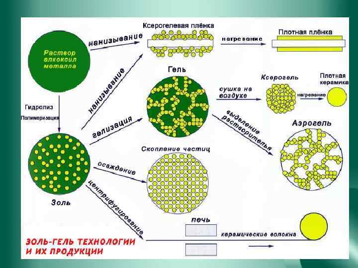 Введение Создание материалов с новыми заранее заданными свойствами возможна на основе химических, коллоидных процессов. Многообещающими в этом отношении являются процессы превращения золя в гель, а далее в твёрдое тело. С определёнными свойствами на базе которых и разрабатываются принципиально новые золь-гель технологии. Золь-гель процессы способны проходить: 1. при низких температурах 2. атмосферным давлением 3. создаются материалы регулируемого состава и структуры