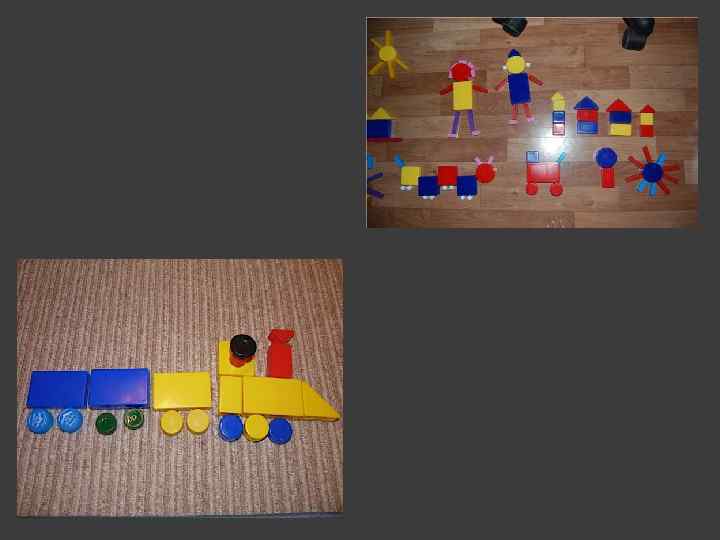 ФОРМЫ ОРГАНИЗАЦИИ РАБОТЫ С ЛОГИЧЕСКИМИ БЛОКАМИ Образовательных областях, обеспечивающие наглядность, системность и доступность, смену деятельности. Совместная и самостоятельная игровая деятельность (дидактические игры, настольно-печатные, подвижные, сюжетно-ролевые игры). а) в подвижных играх (предметные ориентиры, обозначения домиков, дорожек, лабиринтов); б) как настольно-печатные (изготовить карты к играм “Рассели жильцов”, “Найди место фигуре”); в) в сюжетно-ролевых играх: “Магазин” - деньги обозначаются блоками. “Почта” - адрес на доме обозначается кодовыми карточками. Аналогично, “Поезд” - билеты, места. Вне образовательных областях, в предметно-развивающей среде (ИЗОдеятельность, аппликация, режимные моменты, предметные ориентиры).