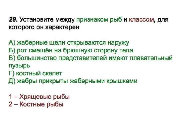 Установите соответствие между признаком рыб и классом, для которого он характерен. ПРИЗНАК РЫБ A) жаберные щели открываются наружу Б) рот смещён на брюшную сторону тела B) большинство представителей имеют плавательный пузырь Г) костный скелет Д) жабры прикрыты жаберными крышками КЛАСС 1) Хрящевые рыбы 2) Костные рыбы