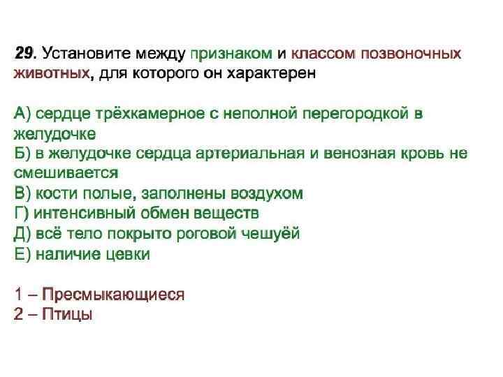 Установите соответствие между признаком животного и классом, для которого он характерен. ПРИЗНАК A) теплокровность Б) температура тела зависит от температуры окружающей среды B) сердце трёхкамерное, два круга кровообращения Г) тело при перемещении обычно соприкасается с землёй Д) характерно двойное дыхание Е) артериальная и венозная кровь в сердце не смешиваются КЛАСС ЖИВОТНЫХ 1) Птицы 2) Пресмыкающиеся