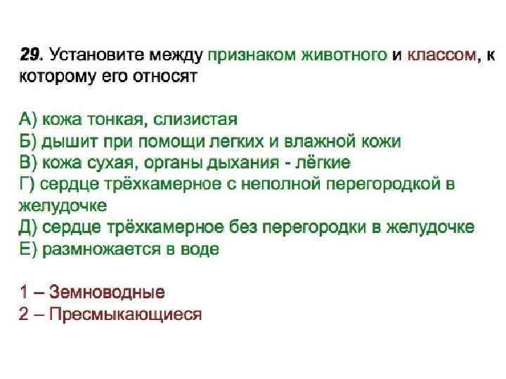 Установите соответствие между признаком животного и классом, для которого этот признак характерен. ПРИЗНАК ЖИВОТНОГО A) дыхание лёгочное и кожное Б) сердце не имеет перегородки в желудочке B) кожа сухая, без желёз Г) развитие с превращением Д) размножение происходит на суше Е) оплодотворение внутреннее КЛАСС 1) Земноводные 2) Пресмыкающиеся