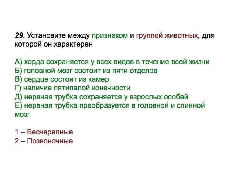Установите соответствие между признаком и группой животных, для которой он характерен. ПРИЗНАК A) хорда сохраняется у всех видов в течение жизни Б) головной мозг состоит из пяти отделов B) сердце состоит из камер Г) наличие пятипалой конечности Д) нервная трубка сохраняется у взрослых особей Е) нервная трубка преобразуется в головной и спинной мозг ГРУППА ЖИВОТНЫХ 1) бесчерепные 2) позвоночные