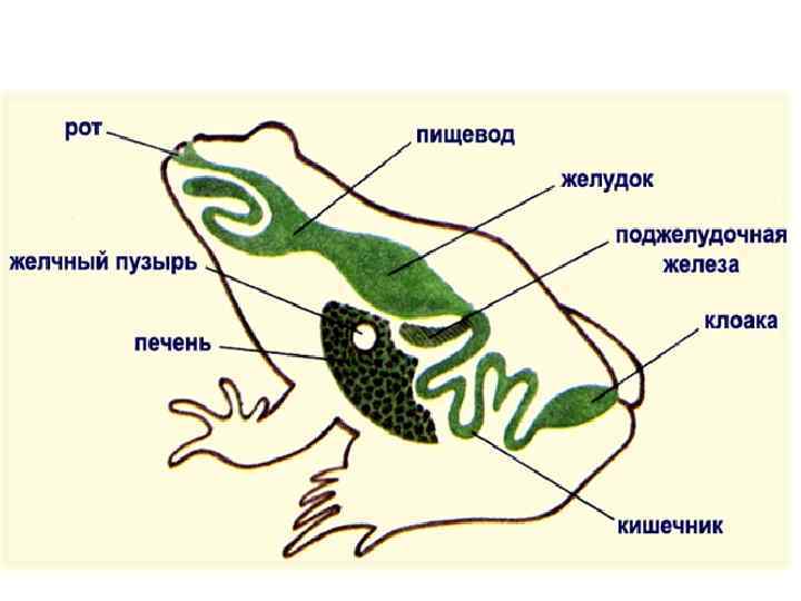 Внутреннее строение лягушки Пищеварительная система: слюнные железы, клоака. Дыхательная система: парные легкие, дыхание через кожу. Кровеносная система: 3 -камерное сердце, 2 круга кровообращения. Нервная система: хорошо развит передний мозг, мозжечок недоразвит. Органы чувств: появляется среднее ухо, хорошо развито обоняние.