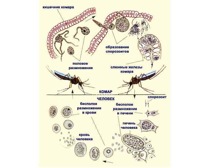 Тип Споровики • Практически все – паразиты. Малярийный плазмодий. При укусе малярийного комара в кровь попадают малярийные паразиты. Они внедряются в клетки печени, где растут, превращаясь в форму напоминающую многоклеточную амебу, затем паразит многократно делится и в кровь выходят мелкии плазмодии, которые внедряются в эритроциты. Затем они опять делятся. Когда паразиты выходят из эритроцита в нее попадают продукты их обмена, они ядовиты и вызывают лихорадку. После нескольких этапов размножения в эритроцитах образуются предшественники макро и микрогамет. Далее кровь должен выпить комар. В желудке комара образуются гаметы, они сливаются, зигота выползает на наружную стенку желудка. Первое деление зиготы – мейоз. Получившиеся гаплоидные клетки многократно делится и в гемолимфу комара попадают новые паразиты, потом они попадают в слюнные железы. • Организм, в котором происходит половой процесс паразита – окончательный хозяин. Организм, где происходит бесполое размножение – промежуточный хозяин.