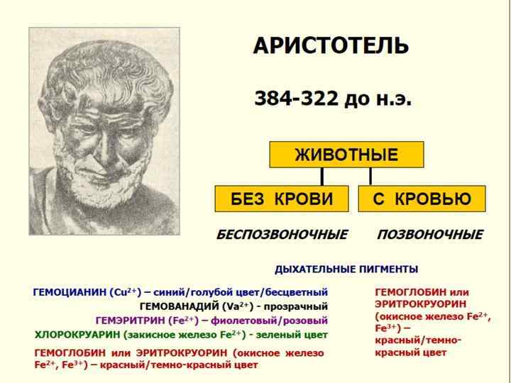 Среди животных «с следующие группы: кровью» были выделены 1) «живородящие четвероногие» (млекопитающие), 2) птицы, 3) «яйцекладущие четвероногие и безногие» (амфибии и рептилии), 4) «живородящие безногие с легочным дыханием» (китообразные), 5) «покрытые чешуей безногие, дышащие жабрами» (рыбы). Бескровных животных Аристотель подразделил на четыре группы: 1)мягкотелые (головоногие), 2) мягкоскорлупные (ракообразные), 3) насекомые (хелицеровые и трахейные) и 4) черепокожные (раковинные моллюски и иглокожие).