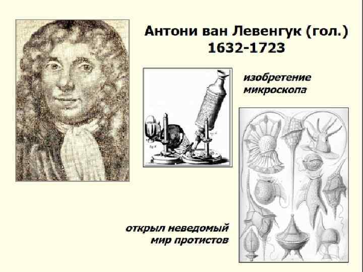 Левенгук первым открыл: эритроциты, описал бактерии (1683), дрожжи, простейших, чешуйки эпидермиса кожи, Зарисовал сперматозоиды (1677), строение глаз насекомых, Описал инфузорий ряд коловраток, почкование гидр Формируется новая область биологии — микроскопическая анатомия, на основе которой в дальнейшем развились гистология, цитология, эмбриология.