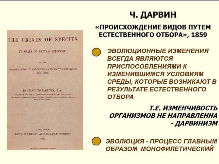 «Философия зоологии» , 1809 «Обстоятельства влияют на форму и организацию животных… Если это выражение будет понято дословно, меня, без сомнения, упрекнут в ошибке, ибо, каковы бы ни были обстоятельства, они сами по себе не производят никаких изменений в форме и организации животных. Но значительное изменение обстоятельств приводит к существенным изменениям в потребностях, а изменение этих последних по необходимости влекут за собой изменения в действиях. И вот, если новые потребности становятся постоянными или весьма длительными, животные приобретают привычки, которые оказываются столь же длительными, как и обусловившие их потребности … Если обстоятельства приводят к тому, что состояние индивидуумов становится для них обычным и постоянным, то внутренняя организация таких индивидуумов, в конце концов, изменяется. Потомство, получающееся при скрещивании таких индивидуумов, сохраняет приобретённые изменения и, в результате образуется порода, сильно отличающаяся от той, индивидуумы которой все время находились в условиях, благоприятных для их развития. » «Известно, что это самое высокое из млекопитающих животных обитает во внутренних областях Африки и водится в местах, где почва почти всегда сухая и лишена растительности. Это заставляет жирафа объедать листву деревьев и делать постоянные усилия, чтобы дотянуться до неё. Вследствие этой привычки, существующей с давних пор у всех особей данной породы, передние ноги жирафа стали длиннее задних, а его шея настолько удлинилась, что это животное, даже не приподнимаясь на задних ногах, подняв только голову, достигает шести метров в