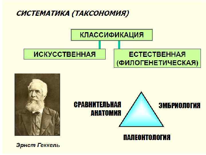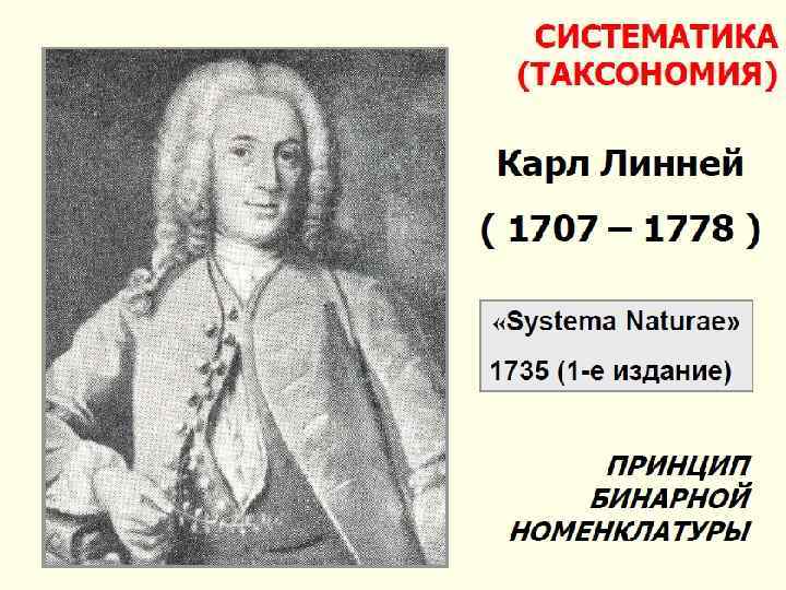 Основоположником систематики считают знаменитого шведского ученого Карла Линнея (1707— 1778) Самая главная заслуга К. Линнея в том, что он сформулировал важнейшие принципы систематики. Он предложил иерархию систематических категорий: • класс, • порядок (у животных — отряд), • род, • вид; • ввел бинарную номенклатуру для вида (двойное название, включающее название рода и вида), • единый для систематики латинский язык, • правило авторского приоритета в названии вида. Его основной труд «Система природы» вышел в свет в 1735 г. и имел ошеломляющий успех