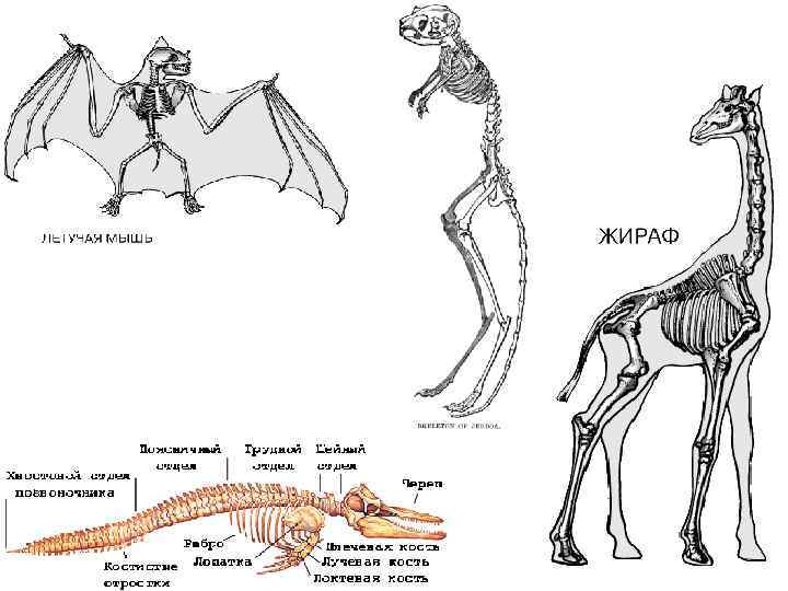 Скелет млекопитающего: 1 — череп; 2 — нижняя челюсть; 3 — шейные позвонки; 4 — грудные позвонки; 5 — поясничные позвонки; 6 — крестец; 7 — хвостовые позвонки; 8 — ребра; 9 — грудина; 10 — лопатка; 11 — плечевая кость; 12 — локтевая кость; 13 — лучевая кость; 14 — кости запястья; 15 — кости пясти; 16 — фаланги пальцев передней конечности; 17 — таз; 18 — бедренная кость; 19 — большая берцовая кость; 20 — малая берцовая кость; 21 — кости предплюсны; 22 — кости плюсны; 23 — фаланги пальцев задней конечности; 24 — коленная чашечка.