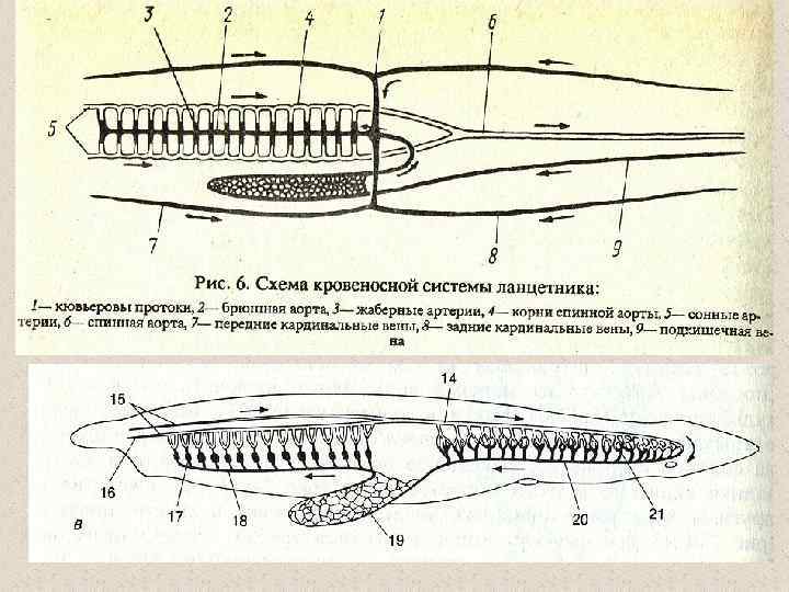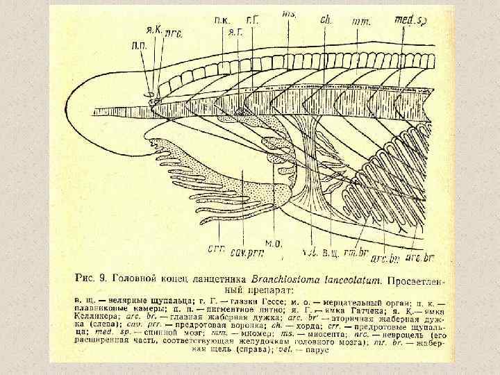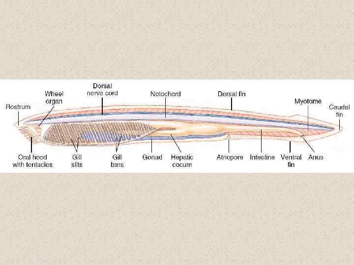 Признаки примитивной и прогрессивной организации ланцетника и черты его специализации Признаки примитивной организации (сравнение с позвоночными) • слабое развитие опорных образований • слабое развитие органов чувств • отсутствие дифференцировки ЦНС Признаки прогрессивной организации (сравнение с беспозвоночными) Признаки специализации • полупрозрачное тело • хорда • слизистые клетки в коже • миохордальный комплекс • укрепление переднего конца тела за счет хорды • замкнутая кровеносная система • нервная трубка • резкое увеличение количества жаберных щелей • метамерность • увеличение объёма глотки • протонефридии • превращение нервной трубки в «светочувствительную линейку» • слабая дифференцировка кишечной трубки • однослойность кожного эпителия • отсутствие сердца