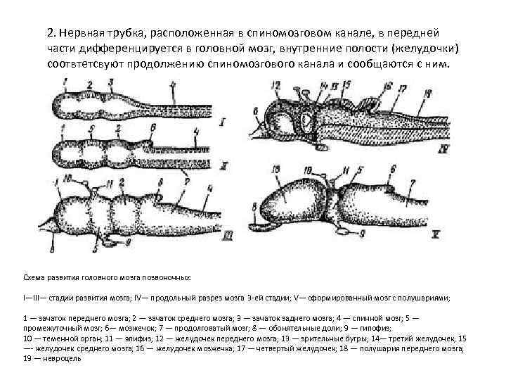 2. Нервная трубка, расположенная в спиномозговом канале, в передней части дифференцируется в головной мозг, внутренние полости (желудочки) соотвтетсвуют продолжению спиномозгового канала и сообщаются с ним. Схема развития головного мозга позвоночных: I—III— стадии развития мозга; IV— продольный разрез мозга 3 -ей стадии; V— сформированный мозг с полушариями; 1 — зачаток переднего мозга; 2 — зачаток среднего мозга; 3 — зачаток заднего мозга; 4 — спинной мозг; 5 — промежуточный мозг; 6— мозжечок; 7 — продолговатый мозг; 8 — обонятельные доли; 9 — гипофиз; 10 — теменной орган; 11 — эпифиз; 12 — желудочек переднего мозга; 13 — зрительные бугры; 14— третий желудочек; 15 —- желудочек среднего мозга; 16 — желудочек мозжечка; 17 — четвертый желудочек; 18 — полушария переднего мозга; 19 — невроцель