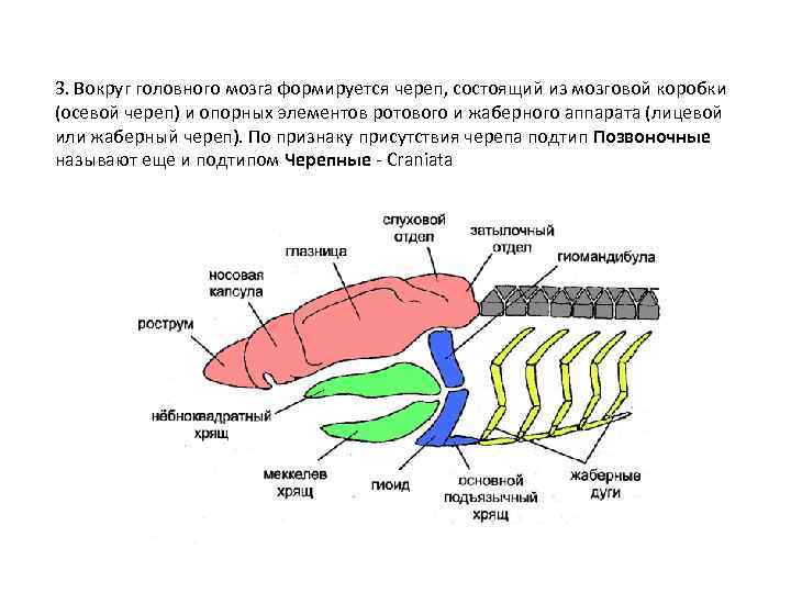 3. Вокруг головного мозга формируется череп, состоящий из мозговой коробки (осевой череп) и опорных элементов ротового и жаберного аппарата (лицевой или жаберный череп). По признаку присутствия черепа подтип Позвоночные называют еще и подтипом Черепные - Craniata