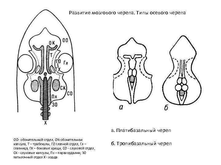 Развитие мозгового черепа. Типы осевого черепа а. Платибазальный череп ОО- обонятельный отдел, ОК-обонятельная капсула, Т – трабекулы, ГО глазной отдел, Гл – б. Тропибазальный череп глазница, ГХ – боковые хрящи, СО - слуховой отдел, СК - слуховые капсулы, Пх – парахордалии, ЗО затылочный отдел Х - хорда