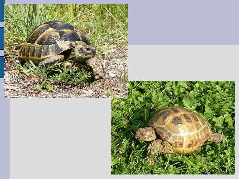 Рептилии Из всех рептилий чаще всего содержат сухопутных черепах. Черепахи – одна из интереснейших групп животных, история которых насчитывает миллионы лет. Современные черепахи имеют сравнительно небольшие размеры по сравнению со своими предками. Лишь немногие виды достигают длины панциря более 30– 35 см. В настоящее время известно по разным данным от 8 до 12 родов сухопутных черепах, которые ведут исключительно наземный образ жизни. Из сухопутных черепах в живых уголках чаще всего встречаются средиземноморская и среднеазиатская и черепахи.