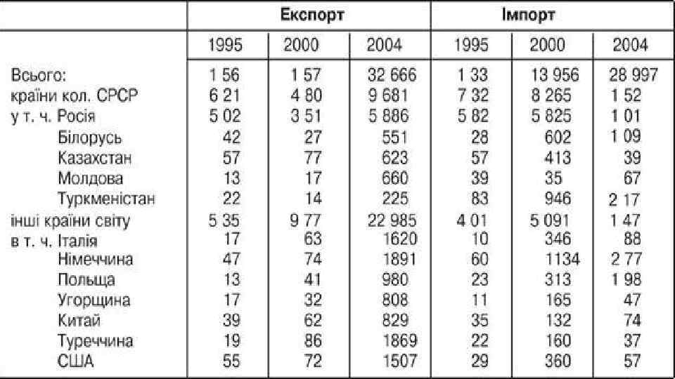 Зовнішню торгівлю товарами Україна здійснює більш як із 160 країнами. Зовнішньоторговельний обіг у 2004 р. досяг максимального рівня — понад 60 млрд дол. , при цьому експорт товарів значно випереджав їх імпорт. Активне сальдо торгівлі сприяє зростанню валютних резервів держави, воно формується під час торгівлі з більшістю країн зовнішньоторговельних партнерів. Натомість у торгівлі з такими високорозвиненими країнами, як Австрія, Велика Британія, Франція, Німеччина, Японія, Україна має пасивне сальдо.