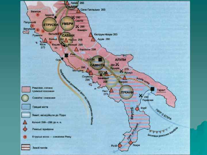 Зовнішня політика періоду республіки. u u u Зовнішня політика часів республіки характеризується наростанням імперіалістичних настроїв. Боротьба проти етрусків переросла у боротьбу за розширення підлеглої Римові території. Приблизно 493 р. до н. е. було створено Латинську Лігу для захисту від етрусків. Пізніше розпочалися завойовницькі війни у всій Італії. Цей період завоювань 390 р. до н. е. був перерваний великою воєнною катастрофою, коли військо галлів з долини ріки По вторглося в Італію та захопило частину Риму, вимагаючи великого викупу за свій відхід. Після відступу галлів завойовницькі війни продовжувалися. Окремі грецькі міста чинили латинянам та їхнім союзникам сильний спротив. Громадяни міста Таранто закликали на допомогу епірського царя Пірра (правив 282 -272 до н. е. ). Він переміг римлян у двох великих битвах, але ціною таких непомірних людських і матеріальних втрат, що його перемоги у результаті були позбавлені будь-якого сенсу („Піррові перемоги"). У 275 р. до н. е. Пірр покинув півострів, а до середини III ст. до н. е. римляни встановили свою владу над усією територією майбутньої Італії.
