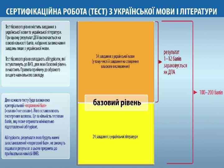 ЗОВНІШНЄ НЕЗАЛЕЖНЕ ОЦІНЮВАННЯ Новації ЗНО-2015 q. Термін дії сертифіката обмежений одним роком q. Нова системи визначення результатів: введення категорії «склав/не склав» q. Тести двох рівнів складності (базовий та поглиблений) з української мови і літератури та математики q. Результат ЗНО з української мови та літератури (частина базового рівня - українська мова) зараховується як результат ДПА для всіх випускників старшої школи ЗНЗ q. Термін проведення: квітень-липень