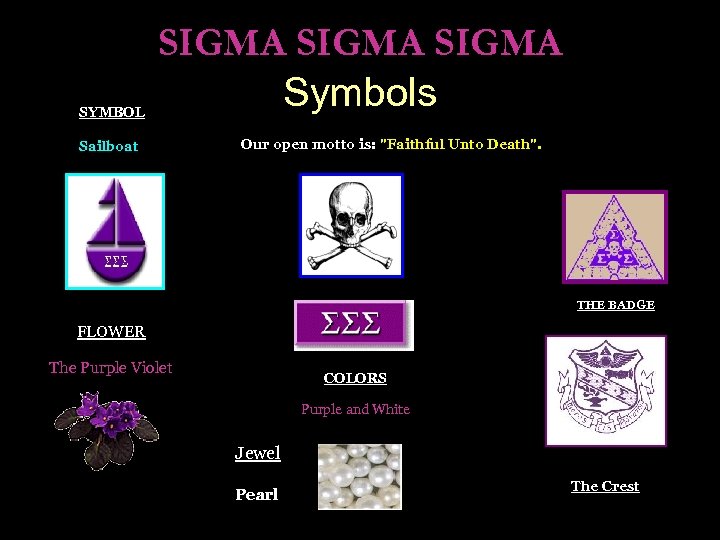 SYMBOL SIGMA Symbols Sailboat Our open motto is: "Faithful Unto Death". THE BADGE FLOWER The Purple Violet COLORS Purple and White Jewel Pearl The Crest