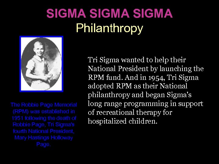 SIGMA Philanthropy The Robbie Page Memorial (RPM) was established in 1951 following the death of Robbie Page, Tri Sigma's fourth National President, Mary Hastings Holloway Page. Tri Sigma wanted to help their National President by launching the RPM fund. And in 1954, Tri Sigma adopted RPM as their National philanthropy and began Sigma's long range programming in support of recreational therapy for hospitalized children.