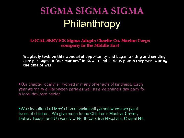 SIGMA Philanthropy LOCAL SERVICE Sigma Adopts Charlie Co. Marine Corps company in the Middle East We gladly took on this wonderful opportunity and began writing and sending care packages to "our marines" in Kuwait and various places they went during the time of war. §Our chapter locally is involved in many other acts of kindness. Each year we throw a Halloween party as well as a Valentine's day party for a local day care center. §We also attend all Men's home basketball games where we paint faces of children. We give much to the Children's Medical Center, Dallas, Texas, and University of North Carolina Hospitals, Chapel Hill.