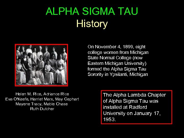 ALPHA SIGMA TAU History On November 4, 1899, eight college women from Michigan State Normal College (now Eastern Michigan University) formed the Alpha Sigma Tau Sorority in Ypsilanti, Michigan Helen M. Rice, Adriance Rice Eva O'Keefe, Harriet Marx, May Gephart Mayene Tracy, Mable Chase Ruth Dutcher The Alpha Lambda Chapter of Alpha Sigma Tau was installed at Radford University on January 17, 1953.