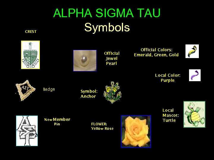 CREST ALPHA SIGMA TAU Symbols Official Jewel Pearl Official Colors: Emerald, Green, Gold Local Color: Purple Badge New Member Pin Symbol: Anchor FLOWER: Yellow Rose Local Mascot: Turtle