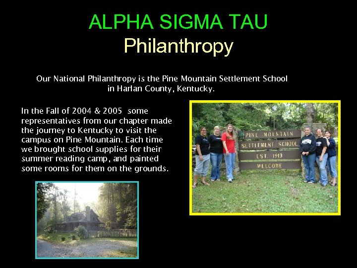 ALPHA SIGMA TAU Philanthropy Our National Philanthropy is the Pine Mountain Settlement School in Harlan County, Kentucky. In the Fall of 2004 & 2005 some representatives from our chapter made the journey to Kentucky to visit the campus on Pine Mountain. Each time we brought school supplies for their summer reading camp, and painted some rooms for them on the grounds.