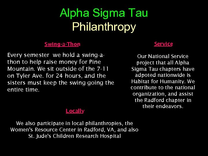 Alpha Sigma Tau Philanthropy Service Swing-a-Thon Every semester we hold a swing-athon to help raise money for Pine Mountain. We sit outside of the 7 -11 on Tyler Ave. for 24 hours, and the sisters must keep the swing going the entire time. Locally Our National Service project that all Alpha Sigma Tau chapters have adpoted nationwide is Habitat for Humanity. We contribute to the national organization, and assist the Radford chapter in their endeavors. We also participate in local philanthropies, the Women's Resource Center in Radford, VA, and also St. Jude's Children Research Hospital