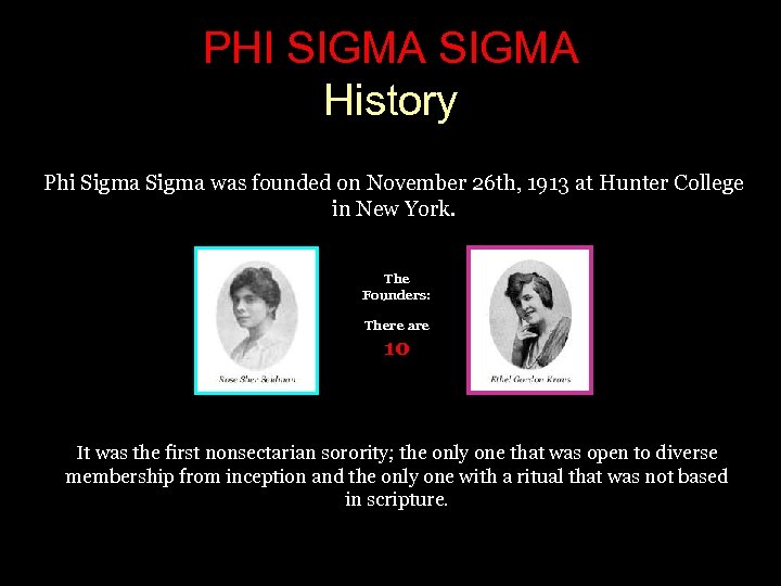 PHI SIGMA History Phi Sigma was founded on November 26 th, 1913 at Hunter College in New York. The Founders: There are 10 It was the first nonsectarian sorority; the only one that was open to diverse membership from inception and the only one with a ritual that was not based in scripture.