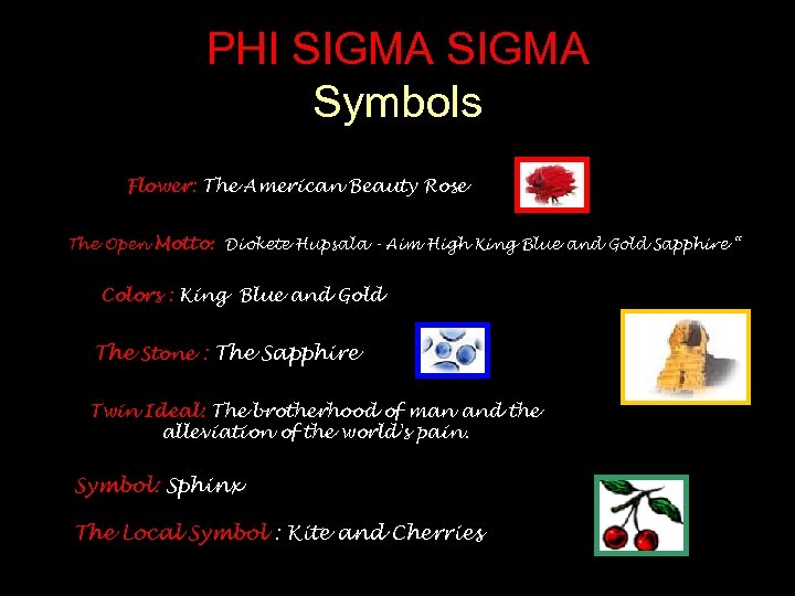 PHI SIGMA Symbols Flower: The American Beauty Rose The Open Motto: Diokete Hupsala - Aim High King Blue and Gold Sapphire “ Colors : King Blue and Gold The Stone : The Sapphire Twin Ideal: The brotherhood of man and the alleviation of the world's pain. Symbol: Sphinx The Local Symbol : Kite and Cherries
