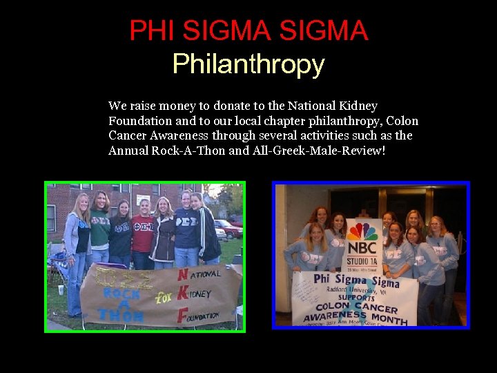 PHI SIGMA Philanthropy We raise money to donate to the National Kidney Foundation and to our local chapter philanthropy, Colon Cancer Awareness through several activities such as the Annual Rock-A-Thon and All-Greek-Male-Review!