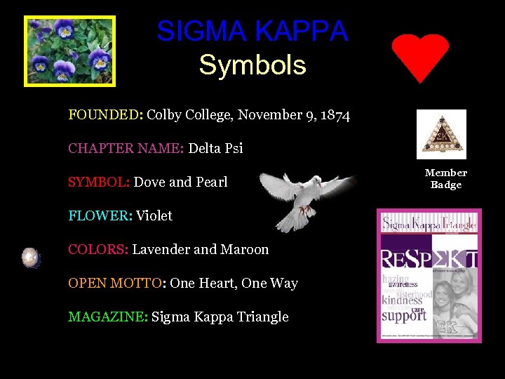 SIGMA KAPPA Symbols FOUNDED: Colby College, November 9, 1874 CHAPTER NAME: Delta Psi SYMBOL: Dove and Pearl FLOWER: Violet COLORS: Lavender and Maroon OPEN MOTTO: One Heart, One Way MAGAZINE: Sigma Kappa Triangle Member Badge