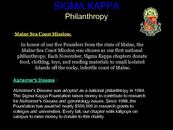 SIGMA KAPPA Philanthropy Maine Sea Coast Mission: In honor of our five Founders from the state of Maine, the Maine Sea Coast Mission was chosen as our first national philanthropy. Each November, Sigma Kappa chapters donate food, clothing, toys, and reading materials to small isolated islands off the rocky, infertile coast of Maine. Alzheimer's Disease : Alzheimer’s Disease was adopted as a national philanthropy in 1984. The Sigma Kappa Foundation raises money to contribute to research for Alzheimer's disease and gerontology issues. Since 1988, the Foundation has awarded nearly $500, 000 in research grants to colleges and universities. Every fall, our chapter sells lollipops on campus to raise money to donate to this charity