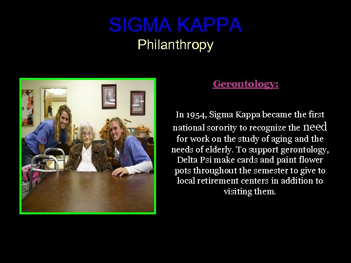 SIGMA KAPPA Philanthropy Gerontology: In 1954, Sigma Kappa became the first national sorority to recognize the need for work on the study of aging and the needs of elderly. To support gerontology, Delta Psi make cards and paint flower pots throughout the semester to give to local retirement centers in addition to visiting them.