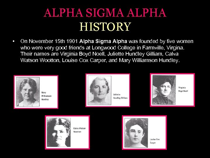ALPHA SIGMA ALPHA HISTORY • On November 15 th 1901 Alpha Sigma Alpha was founded by five women who were very good friends at Longwood College in Farmville, Virgina. Their names are Virginia Boyd Noell, Juliette Hundley Gilliam, Calva Watson Wootton, Louise Cox Carper, and Mary Williamson Hundley.